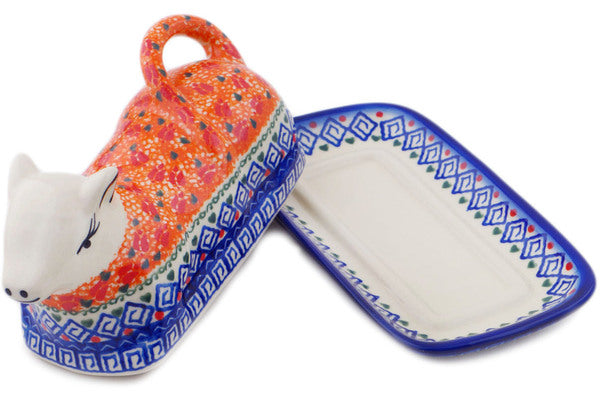 This Grecian Fire Tulips 8" Butter Dish was handmade and hand decorated in Boleslawiec, Poland by skilled artisans according to old traditional methods. This Polish stoneware is microwave, dishwasher, freezer, and oven safe up to 480°F. It does not contain lead or cadmium. It is part of the Grecian Fire Tulips Collection.