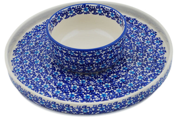 This Flowers On The Lake 13" Chip and Dip and Cake Stand Combo was handmade and hand decorated in Boleslawiec, Poland by skilled artisans according to old traditional methods. This Polish stoneware is microwave, dishwasher, freezer, and oven safe up to 480°F. It does not contain lead or cadmium. It is part of the Flowers On The Lake Collection.