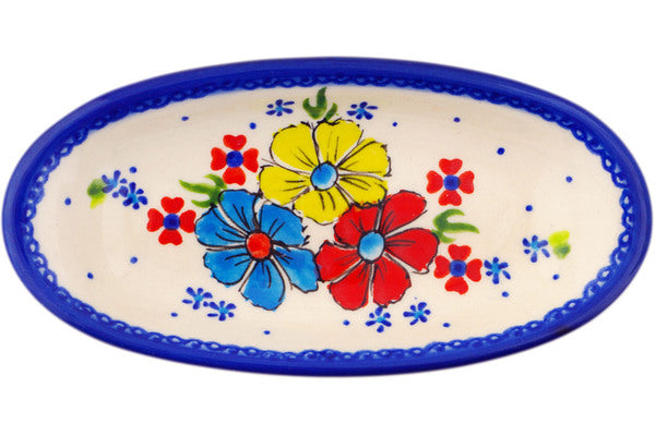 This Country Three 6" Condiment Dish was handmade and hand decorated in Boleslawiec, Poland by skilled artisans according to old traditional methods. This is a Polish pottery Signature Unikat, which means that it has been hand painted with both sponges and brushes and it is signed by the artist who painted it. Unikat pieces are the most intricate works of art. Larger Unikat items take hours of very careful work to finish. This Polish stoneware is microwave, dishwasher, freezer, and oven safe up to 480°F. It does not contain lead or cadmium. It is part of the Country Three Collection.