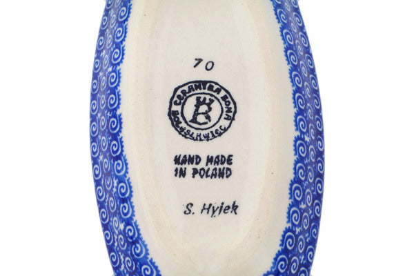 This Blue Poppies 7" Condiment Dish was handmade and hand decorated in Boleslawiec, Poland by skilled artisans according to old traditional methods. This Polish stoneware is microwave, dishwasher, freezer, and oven safe up to 480°F. It does not contain lead or cadmium. It is part of the Blue Poppies Collection.