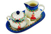This Blue Poppy Dream Cream & Sugar Set was handmade and hand decorated in Boleslawiec, Poland by skilled artisans according to old traditional methods. This is a Polish pottery Signature Unikat, which means that it has been hand painted with both sponges and brushes and it is signed by the artist who painted it. Unikat pieces are the most intricate works of art. Larger Unikat items take hours of very careful work to finish. This Polish stoneware is microwave, dishwasher, freezer, and oven safe up to 480°F. It does not contain lead or cadmium. It is part of the Blue Poppy Dream Collection.