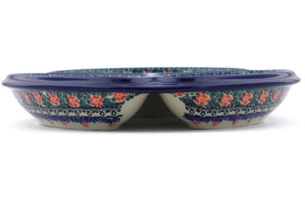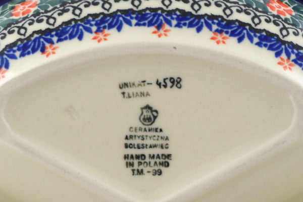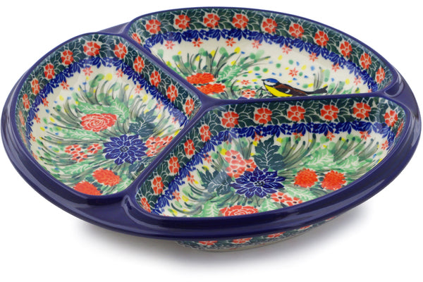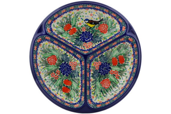 This Garden Bird 10" Divided Dish was handmade and hand decorated in Boleslawiec, Poland by skilled artisans according to old traditional methods. This is a Polish pottery Signature Unikat, which means that it has been hand painted with both sponges and brushes and it is signed by the artist who painted it. Unikat pieces are the most intricate works of art. Larger Unikat items take hours of very careful work to finish. This Polish stoneware is microwave, dishwasher, freezer, and oven safe up to 480°F. It does not contain lead or cadmium. It is part of the Garden Bird Collection.