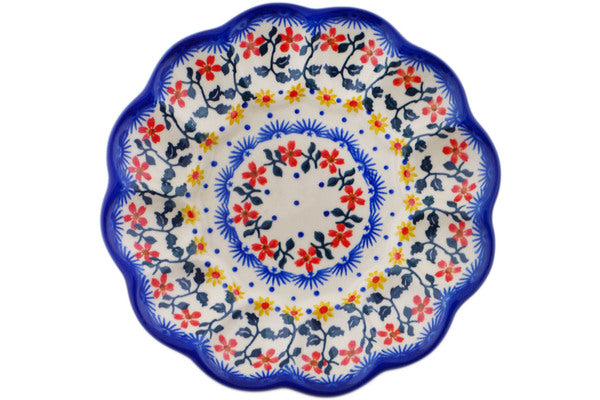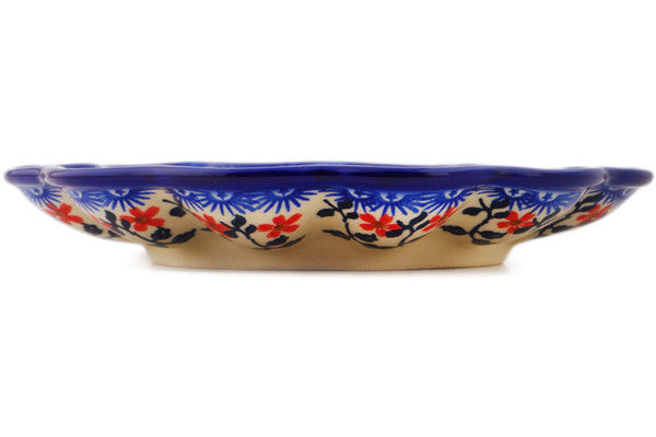 This Red Sunflower 8" Egg Plate was handmade and hand decorated in Boleslawiec, Poland by skilled artisans according to old traditional methods. This Polish stoneware is microwave, dishwasher, freezer, and oven safe up to 480°F. It does not contain lead or cadmium. It is part of the Red Sunflower Collection.