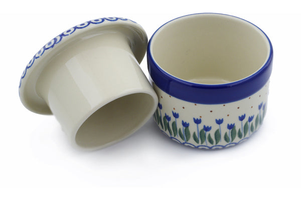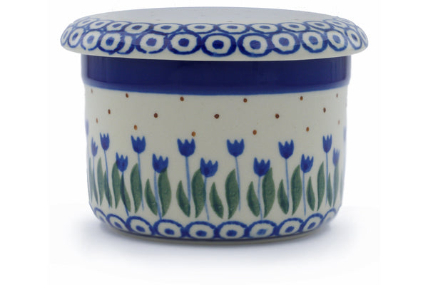 This Water Tulip 4" French Butter Dish was handmade and hand decorated in Boleslawiec, Poland by skilled artisans according to old traditional methods. This Polish stoneware is microwave, dishwasher, freezer, and oven safe up to 480°F. It does not contain lead or cadmium. It is part of the Water Tulip Collection.
