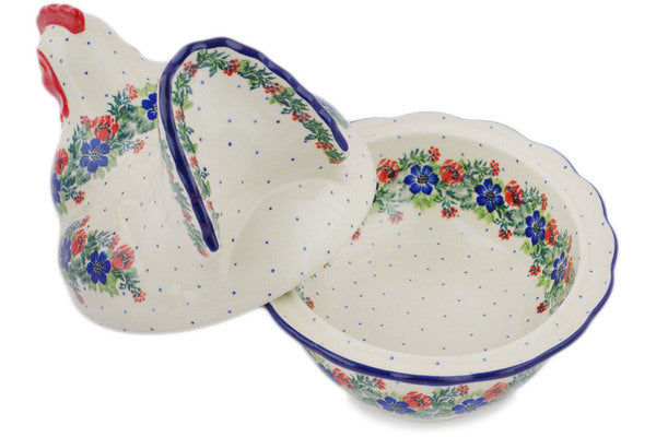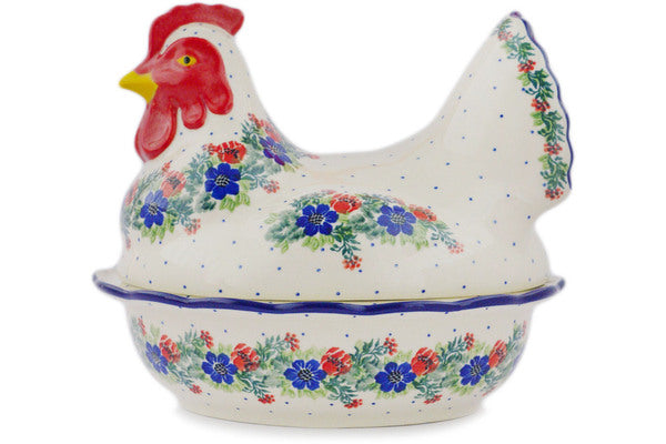 This Polish Wreath 9" Hen Shaped Jar was handmade and hand decorated in Boleslawiec, Poland by skilled artisans according to old traditional methods. This Polish stoneware is microwave, dishwasher, freezer, and oven safe up to 480°F. It does not contain lead or cadmium. It is part of the Polish Wreath Collection.