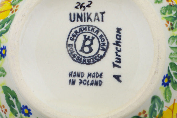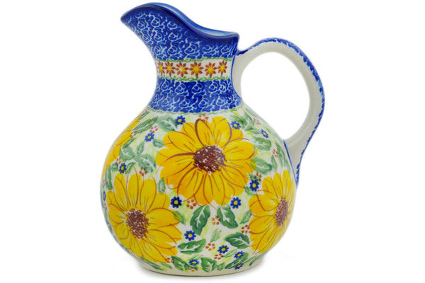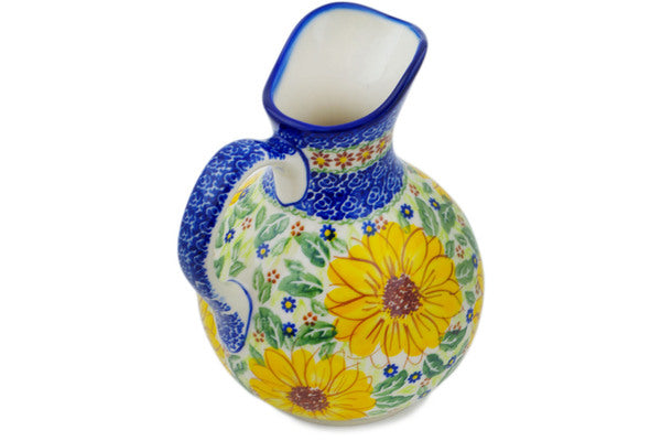 This Sunflower Yellow Petal Bliss 5 Cup Pitcher was handmade and hand decorated in Boleslawiec, Poland by skilled artisans according to old traditional methods. This is a Polish pottery Signature Unikat, which means that it has been hand painted with both sponges and brushes and it is signed by the artist who painted it. Unikat pieces are the most intricate works of art. Larger Unikat items take hours of very careful work to finish. This Polish stoneware is microwave, dishwasher, freezer, and oven safe up to 480°F. It does not contain lead or cadmium. It is part of the Sunflower Yellow Petal Bliss Collection.