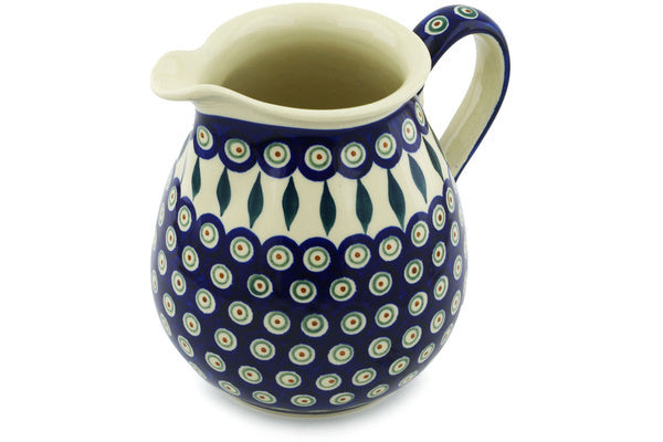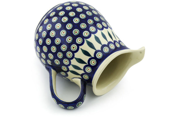 This Peacock Leaves 9 Cup Pitcher was handmade and hand decorated in Boleslawiec, Poland by skilled artisans according to old traditional methods. This Polish stoneware is microwave, dishwasher, freezer, and oven safe up to 480°F. It does not contain lead or cadmium. It is part of the Peacock Leaves Collection.
