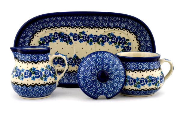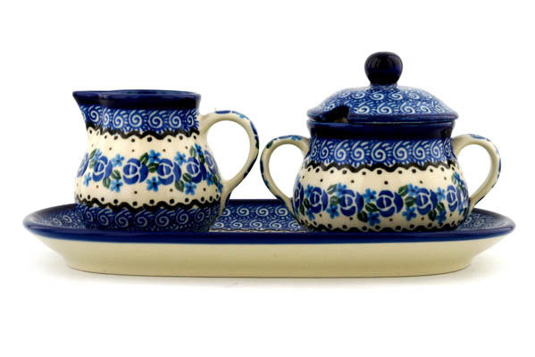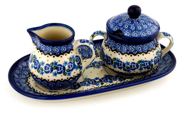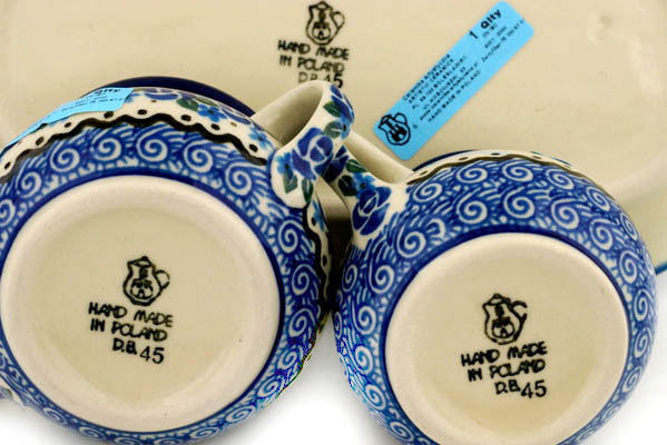 This Blue Bud Sea 10" Sugar and Creamer Set was handmade and hand decorated in Boleslawiec, Poland by skilled artisans according to old traditional methods. This Polish stoneware is microwave, dishwasher, freezer, and oven safe up to 480°F. It does not contain lead or cadmium. It is part of the Blue Bud Sea Collection.