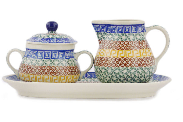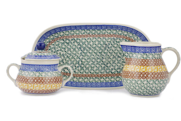 This Grecian Sea 11" Sugar and Creamer Set was handmade and hand decorated in Boleslawiec, Poland by skilled artisans according to old traditional methods. This Polish stoneware is microwave, dishwasher, freezer, and oven safe up to 480°F. It does not contain lead or cadmium. It is part of the Grecian Sea Collection.