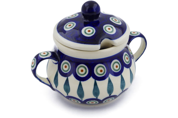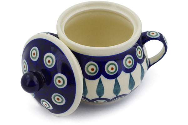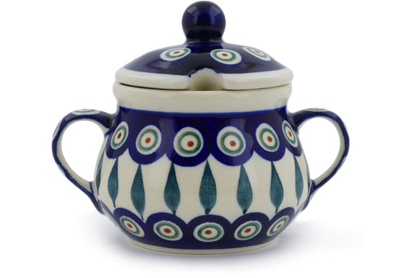 This Peacock Leaves 8 oz Sugar Bowl was handmade and hand decorated in Boleslawiec, Poland by skilled artisans according to old traditional methods. This Polish stoneware is microwave, dishwasher, freezer, and oven safe up to 480°F. It does not contain lead or cadmium. It is part of the Peacock Leaves Collection.