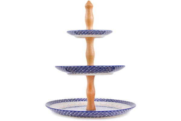 This Wave Of Flowers 16" Tiered Serving Stand was handmade and hand decorated in Boleslawiec, Poland by skilled artisans according to old traditional methods. This Polish stoneware is microwave, dishwasher, freezer, and oven safe up to 480°F. It does not contain lead or cadmium. It is part of the Wave Of Flowers Collection.