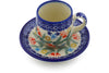 This Blue Eye Spring espresso cup with saucer was handmade and hand decorated in Boleslawiec, Poland by skilled artisans according to old traditional methods. This Polish stoneware is microwave, dishwasher, freezer, and oven safe up to 480°F. It does not contain lead or cadmium. It is part of the Blue Eye Spring Collection.