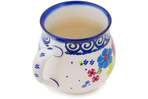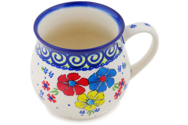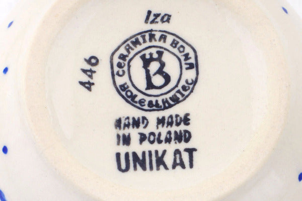 This Country Three 21 oz Bubble Mug was handmade and hand decorated in Boleslawiec, Poland by skilled artisans according to old traditional methods. This is a Polish pottery Signature Unikat, which means that it has been hand painted with both sponges and brushes and it is signed by the artist who painted it. Unikat pieces are the most intricate works of art. Larger Unikat items take hours of very careful work to finish. This Polish stoneware is microwave, dishwasher, freezer, and oven safe up to 480°F. It does not contain lead or cadmium. It is part of the Country Three Collection.