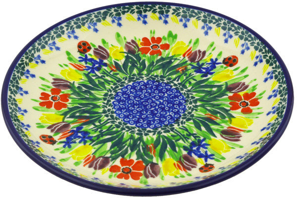 This Lady Bug Tulips 8" Dessert Plate was handmade and hand decorated in Boleslawiec, Poland by skilled artisans according to old traditional methods. This is a Polish pottery Signature Unikat, which means that it has been hand painted with both sponges and brushes and it is signed by the artist who painted it. Unikat pieces are the most intricate works of art. Larger Unikat items take hours of very careful work to finish. This Polish stoneware is microwave, dishwasher, freezer, and oven safe up to 480°F. It does not contain lead or cadmium. It is part of the Lady Bug Tulips Collection.