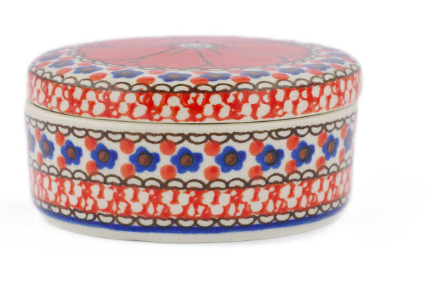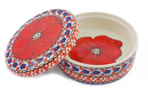 This Crimson Poppies 4" Jewelry Box was handmade and hand decorated in Boleslawiec, Poland by skilled artisans according to old traditional methods. This is a Polish pottery Signature Unikat, which means that it has been hand painted with both sponges and brushes and it is signed by the artist who painted it. Unikat pieces are the most intricate works of art. Larger Unikat items take hours of very careful work to finish. This Polish stoneware is microwave, dishwasher, freezer, and oven safe up to 480°F. It does not contain lead or cadmium. It is part of the Crimson Poppies Collection.