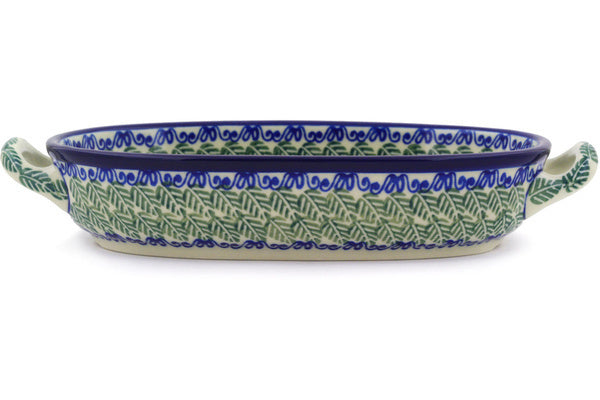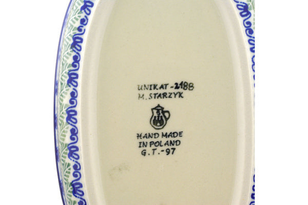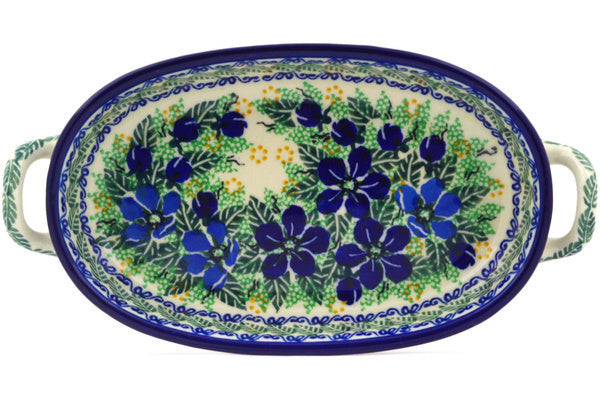 This Forget Me Not Meadow 8-inch Oval Baker with Handles was handmade and hand decorated in Boleslawiec, Poland by skilled artisans according to old traditional methods. This is a Polish pottery Signature Unikat, which means that it has been hand painted with both sponges and brushes and it is signed by the artist who painted it. Unikat pieces are the most intricate works of art. Larger Unikat items take hours of very careful work to finish. This Polish stoneware is microwave, dishwasher, freezer, and oven safe up to 480°F. It does not contain lead or cadmium. It is part of the Forget Me Not Meadow Collection.