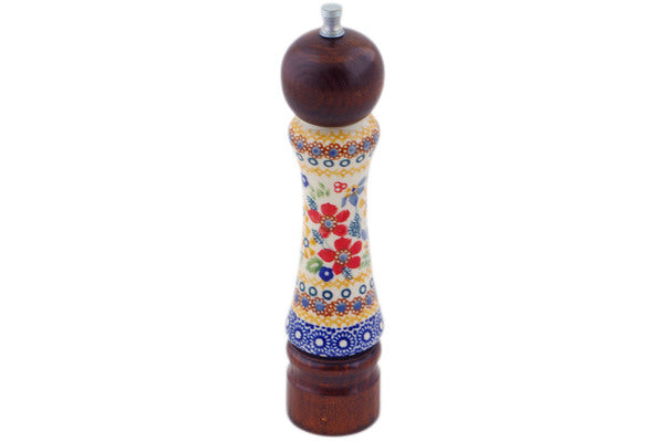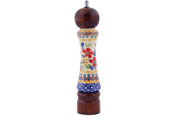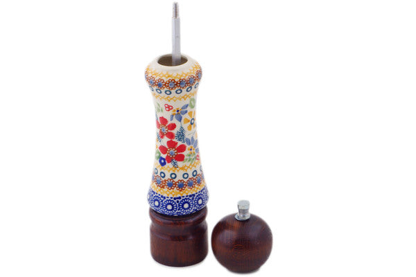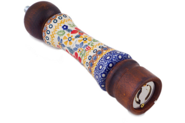This Summer Bouquet 8" Grinder was handmade and hand decorated in Boleslawiec, Poland by skilled artisans according to old traditional methods. This is a Polish pottery Signature Unikat, which means that it has been hand painted with both sponges and brushes and it is signed by the artist who painted it. Unikat pieces are the most intricate works of art. Larger Unikat items take hours of very careful work to finish. This Polish stoneware is microwave, dishwasher, freezer, and oven safe up to 480°F. It does not contain lead or cadmium. It is part of the Summer Bouquet Collection.