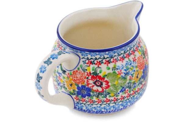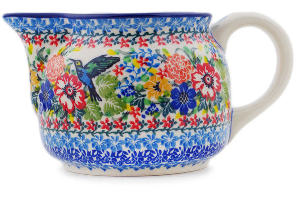 This Hummingbird Meadow 24 oz Pitcher was handmade and hand decorated in Boleslawiec, Poland by skilled artisans according to old traditional methods. This is a Polish pottery Signature Unikat, which means that it has been hand painted with both sponges and brushes and it is signed by the artist who painted it. Unikat pieces are the most intricate works of art. Larger Unikat items take hours of very careful work to finish. This Polish stoneware is microwave, dishwasher, freezer, and oven safe up to 480°F. It does not contain lead or cadmium. It is part of the Hummingbird Meadow Collection.