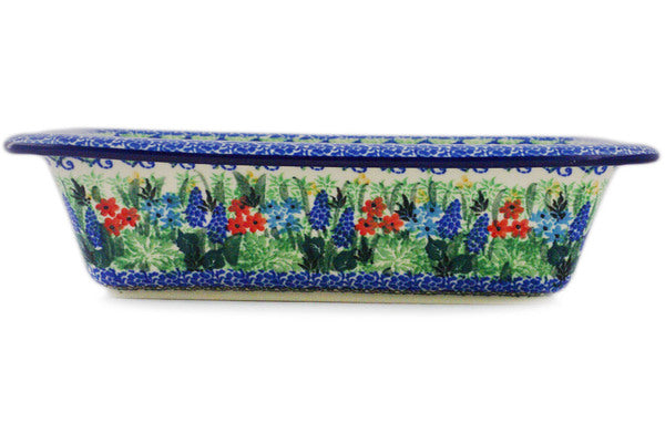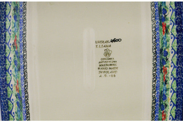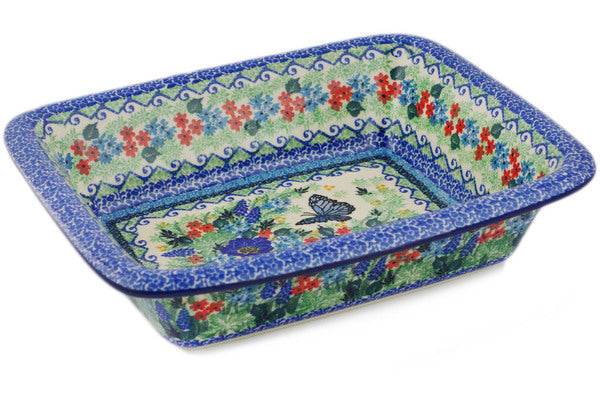 This Mariposa 11" Rectangular Baker was handmade and hand decorated in Boleslawiec, Poland by skilled artisans according to old traditional methods. This is a Polish pottery Signature Unikat, which means that it has been hand painted with both sponges and brushes and it is signed by the artist who painted it. Unikat pieces are the most intricate works of art. Larger Unikat items take hours of very careful work to finish. This Polish stoneware is microwave, dishwasher, freezer, and oven safe up to 480°F. It does not contain lead or cadmium. It is part of the Mariposa Collection.