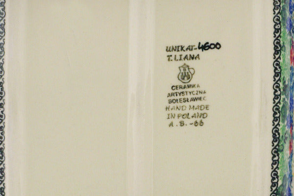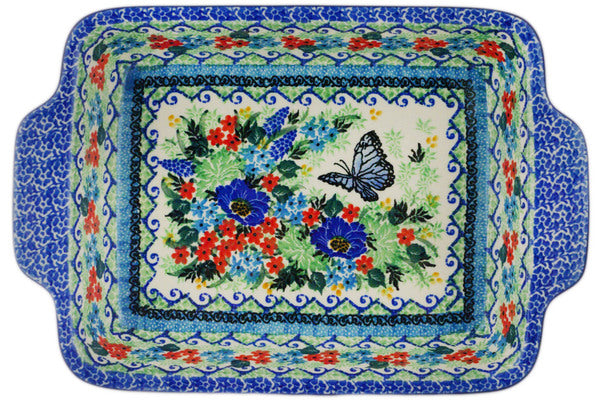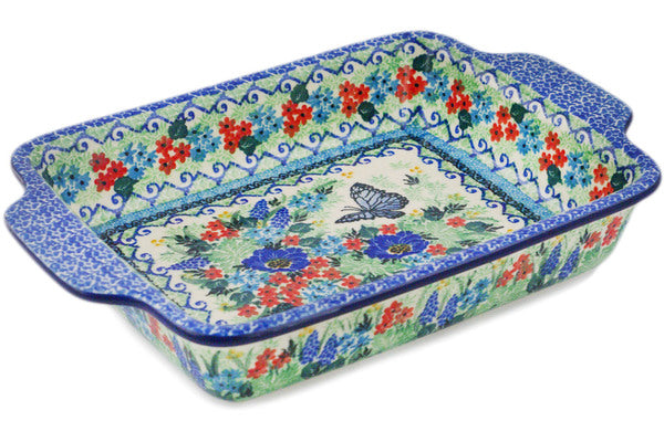 This Mariposa 9½-inch Rectangular Baker with Handles was handmade and hand decorated in Boleslawiec, Poland by skilled artisans according to old traditional methods. This is a Polish pottery Signature Unikat, which means that it has been hand painted with both sponges and brushes and it is signed by the artist who painted it. Unikat pieces are the most intricate works of art. Larger Unikat items take hours of very careful work to finish. This Polish stoneware is microwave, dishwasher, freezer, and oven safe up to 480°F. It does not contain lead or cadmium. It is part of the Mariposa Collection.