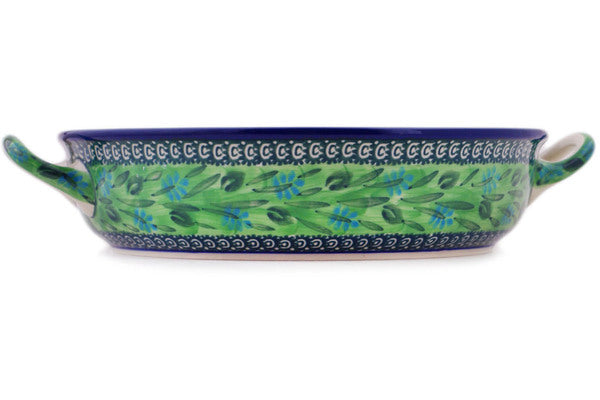 This Dragonfly Delight 11" Round Baker with Handles was handmade and hand decorated in Boleslawiec, Poland by skilled artisans according to old traditional methods. This is a Polish pottery Signature Unikat, which means that it has been hand painted with both sponges and brushes and it is signed by the artist who painted it. Unikat pieces are the most intricate works of art. Larger Unikat items take hours of very careful work to finish. This Polish stoneware is microwave, dishwasher, freezer, and oven safe up to 480°F. It does not contain lead or cadmium. It is part of the Dragonfly Delight Collection.