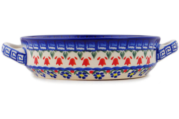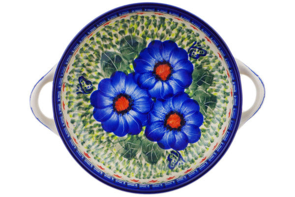 This Brilliant Butterfly Popp 8" Round Baker with Handles was handmade and hand decorated in Boleslawiec, Poland by skilled artisans according to old traditional methods. This is a Polish pottery Signature Unikat, which means that it has been hand painted with both sponges and brushes and it is signed by the artist who painted it. Unikat pieces are the most intricate works of art. Larger Unikat items take hours of very careful work to finish. This Polish stoneware is microwave, dishwasher, freezer, and oven safe up to 480°F. It does not contain lead or cadmium. It is part of the Brilliant Butterfly Popp Collection.