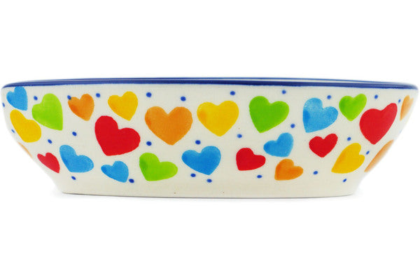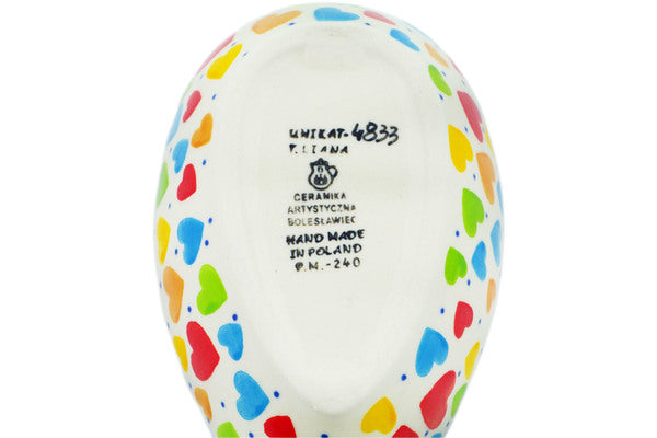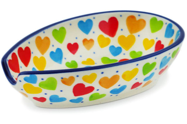 This In Love With Love 5" Spoon Rest was handmade and hand decorated in Boleslawiec, Poland by skilled artisans according to old traditional methods. This is a Polish pottery Signature Unikat, which means that it has been hand painted with both sponges and brushes and it is signed by the artist who painted it. Unikat pieces are the most intricate works of art. Larger Unikat items take hours of very careful work to finish. This Polish stoneware is microwave, dishwasher, freezer, and oven safe up to 480°F. It does not contain lead or cadmium. It is part of the In Love With Love Collection.