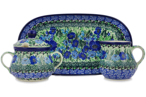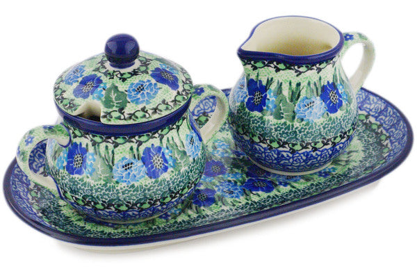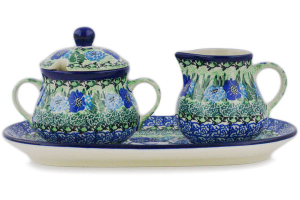 This Moody Blues 10" Sugar and Creamer Set was handmade and hand decorated in Boleslawiec, Poland by skilled artisans according to old traditional methods. This is a Polish pottery Signature Unikat, which means that it has been hand painted with both sponges and brushes and it is signed by the artist who painted it. Unikat pieces are the most intricate works of art. Larger Unikat items take hours of very careful work to finish. This Polish stoneware is microwave, dishwasher, freezer, and oven safe up to 480°F. It does not contain lead or cadmium. It is part of the Moody Blues Collection.