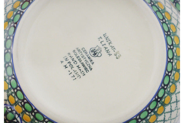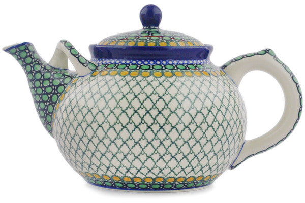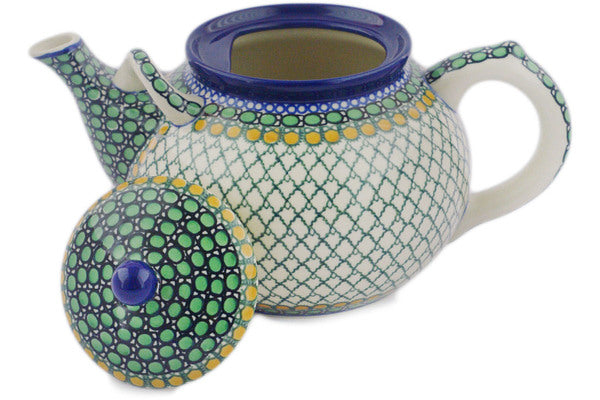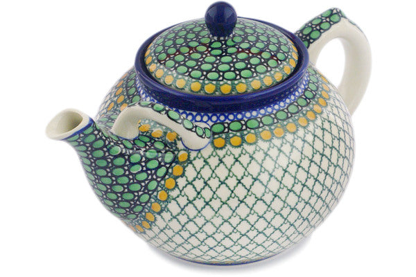This Tranquility 7 cups Tea or Coffee Pot was handmade and hand decorated in Boleslawiec, Poland by skilled artisans according to old traditional methods. This is a Polish pottery Signature Unikat, which means that it has been hand painted with both sponges and brushes and it is signed by the artist who painted it. Unikat pieces are the most intricate works of art. Larger Unikat items take hours of very careful work to finish. This Polish stoneware is microwave, dishwasher, freezer, and oven safe up to 480°F. It does not contain lead or cadmium. It is part of the Tranquility Collection.