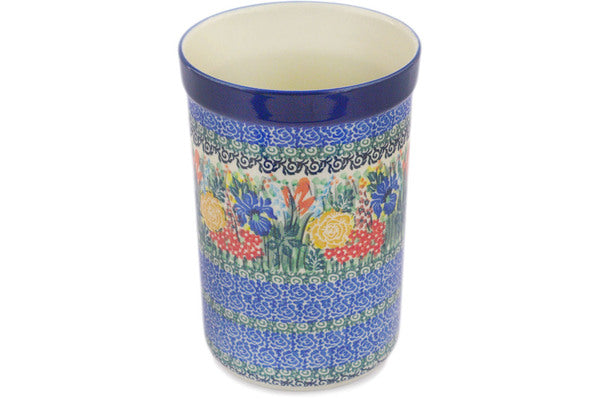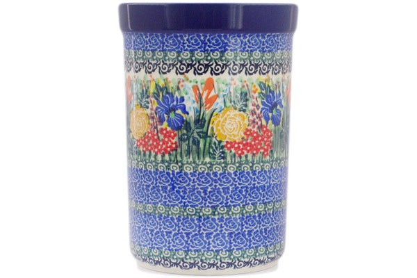 This Iris Bouquet 8" Utensil Jar was handmade and hand decorated in Boleslawiec, Poland by skilled artisans according to old traditional methods. This is a Polish pottery Signature Unikat, which means that it has been hand painted with both sponges and brushes and it is signed by the artist who painted it. Unikat pieces are the most intricate works of art. Larger Unikat items take hours of very careful work to finish. This Polish stoneware is microwave, dishwasher, freezer, and oven safe up to 480°F. It does not contain lead or cadmium. It is part of the Iris Bouquet Collection.