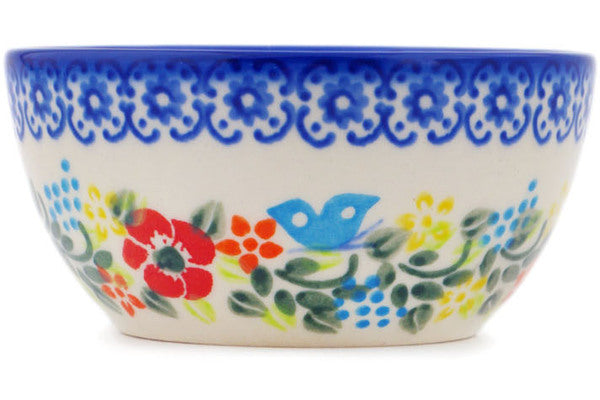 This Ring Of Meadow Flowers 4" Bowl was handmade and hand decorated in Boleslawiec, Poland by skilled artisans according to old traditional methods. This Polish stoneware is microwave, dishwasher, freezer, and oven safe up to 480°F. It does not contain lead or cadmium. It is part of the Ring Of Meadow Flowers Collection.