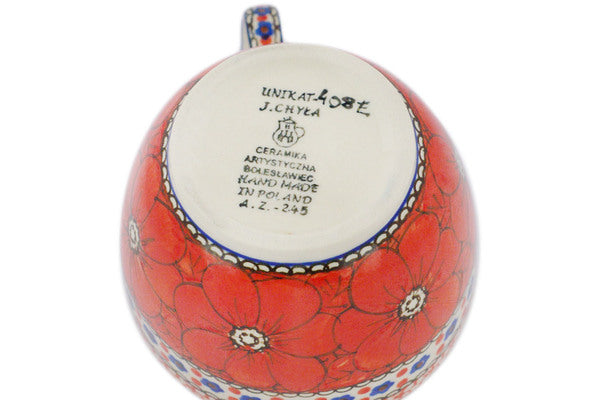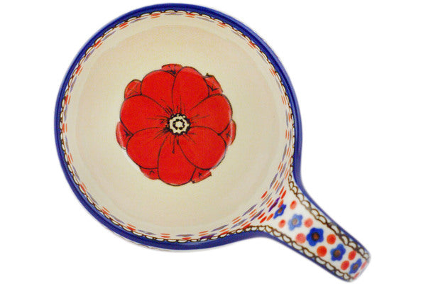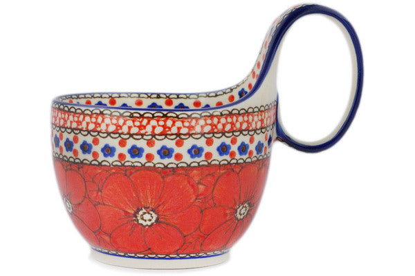 This Crimson Poppies 16 oz Bowl with Loop-Handle was handmade and hand decorated in Boleslawiec, Poland by skilled artisans according to old traditional methods. This is a Polish pottery Signature Unikat, which means that it has been hand painted with both sponges and brushes and it is signed by the artist who painted it. Unikat pieces are the most intricate works of art. Larger Unikat items take hours of very careful work to finish. This Polish stoneware is microwave, dishwasher, freezer, and oven safe up to 480°F. It does not contain lead or cadmium. It is part of the Crimson Poppies Collection.
