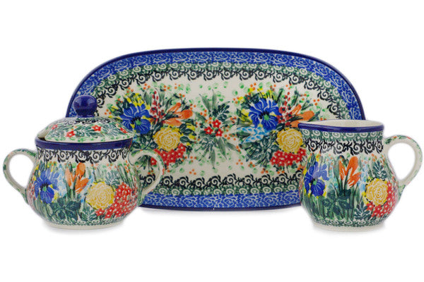 This Iris Bouquet 10" Sugar and Creamer Set was handmade and hand decorated in Boleslawiec, Poland by skilled artisans according to old traditional methods. This is a Polish pottery Signature Unikat, which means that it has been hand painted with both sponges and brushes and it is signed by the artist who painted it. Unikat pieces are the most intricate works of art. Larger Unikat items take hours of very careful work to finish. This Polish stoneware is microwave, dishwasher, freezer, and oven safe up to 480°F. It does not contain lead or cadmium. It is part of the Iris Bouquet Collection.