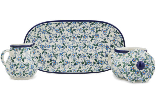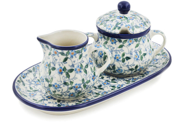 This Summer Wind 10" Sugar and Creamer Set was handmade and hand decorated in Boleslawiec, Poland by skilled artisans according to old traditional methods. This Polish stoneware is microwave, dishwasher, freezer, and oven safe up to 480°F. It does not contain lead or cadmium. It is part of the Summer Wind Collection.