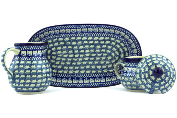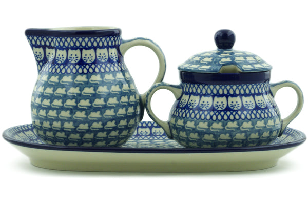 This Cat And Mouse Brigade 11" Sugar and Creamer Set was handmade and hand decorated in Boleslawiec, Poland by skilled artisans according to old traditional methods. This is a Polish pottery Signature Unikat, which means that it has been hand painted with both sponges and brushes and it is signed by the artist who painted it. Unikat pieces are the most intricate works of art. Larger Unikat items take hours of very careful work to finish. This Polish stoneware is microwave, dishwasher, freezer, and oven safe up to 480°F. It does not contain lead or cadmium. It is part of the Cat And Mouse Brigade Collection.