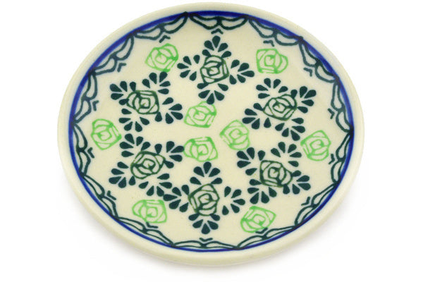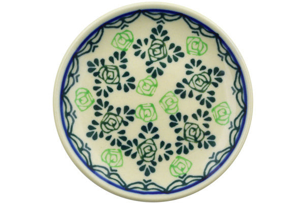This Green Cabbage Rose 4" Mini Plate, Coaster plate was handmade and hand decorated in Boleslawiec, Poland by skilled artisans according to old traditional methods. This Polish stoneware is microwave, dishwasher, freezer, and oven safe up to 480°F. It does not contain lead or cadmium. It is part of the Green Cabbage Rose Collection.