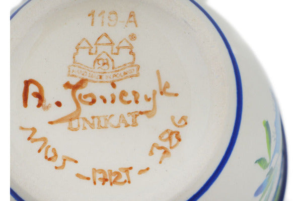 This Delicate Hummingbird 12 oz Mug was handmade and hand decorated in Boleslawiec, Poland by skilled artisans according to old traditional methods. This is a Polish pottery Signature Unikat, which means that it has been hand painted with both sponges and brushes and it is signed by the artist who painted it. Unikat pieces are the most intricate works of art. Larger Unikat items take hours of very careful work to finish. This Polish stoneware is microwave, dishwasher, freezer, and oven safe up to 480°F. It does not contain lead or cadmium. It is part of the Delicate Hummingbird Collection.