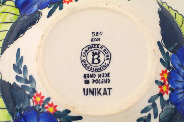 This Blue Bouquet 9" Pasta Bowl was handmade and hand decorated in Boleslawiec, Poland by skilled artisans according to old traditional methods. This is a Polish pottery Signature Unikat, which means that it has been hand painted with both sponges and brushes and it is signed by the artist who painted it. Unikat pieces are the most intricate works of art. Larger Unikat items take hours of very careful work to finish. This Polish stoneware is microwave, dishwasher, freezer, and oven safe up to 480°F. It does not contain lead or cadmium. It is part of the Blue Bouquet Collection.