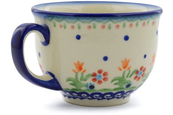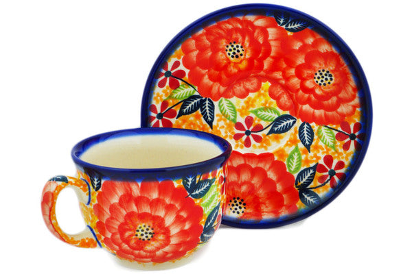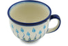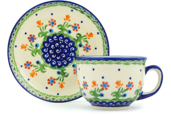 This Peacock Tulip Garden Cup with Saucer was handmade and hand decorated in Boleslawiec, Poland by skilled artisans according to old traditional methods. This Polish stoneware is microwave, dishwasher, freezer, and oven safe up to 480°F. It does not contain lead or cadmium. It is part of the Peacock Tulip Garden Collection.