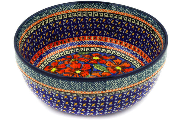 This Poppies 8" Bowl was handmade and hand decorated in Boleslawiec, Poland by skilled artisans according to old traditional methods. This is a Polish pottery Signature Unikat, which means that it has been hand painted with both sponges and brushes and it is signed by the artist who painted it. Unikat pieces are the most intricate works of art. Larger Unikat items take hours of very careful work to finish. This Polish stoneware is microwave, dishwasher, freezer, and oven safe up to 480°F. It does not contain lead or cadmium. It is part of the Poppies Collection.