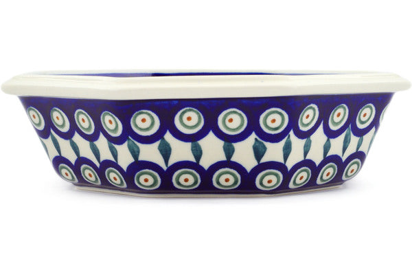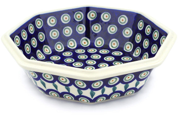 This Peacock Leaves 8" Octagonal Bowl was handmade and hand decorated in Boleslawiec, Poland by skilled artisans according to old traditional methods. This Polish stoneware is microwave, dishwasher, freezer, and oven safe up to 480°F. It does not contain lead or cadmium. It is part of the Peacock Leaves Collection.
