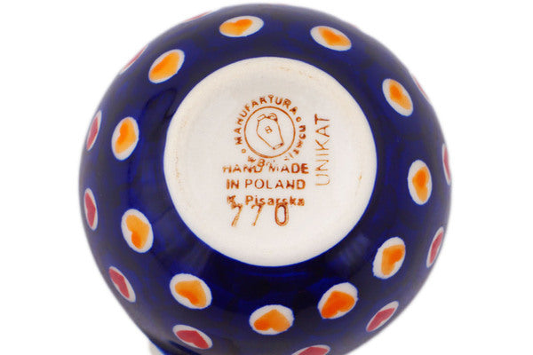 This Heart Disco 2 oz 1/3 Cup Measuring Cup was handmade and hand decorated in Boleslawiec, Poland by skilled artisans according to old traditional methods. This is a Polish pottery Signature Unikat, which means that it has been hand painted with both sponges and brushes and it is signed by the artist who painted it. Unikat pieces are the most intricate works of art. Larger Unikat items take hours of very careful work to finish. This Polish stoneware is microwave, dishwasher, freezer, and oven safe up to 480°F. It does not contain lead or cadmium. It is part of the Heart Disco Collection.