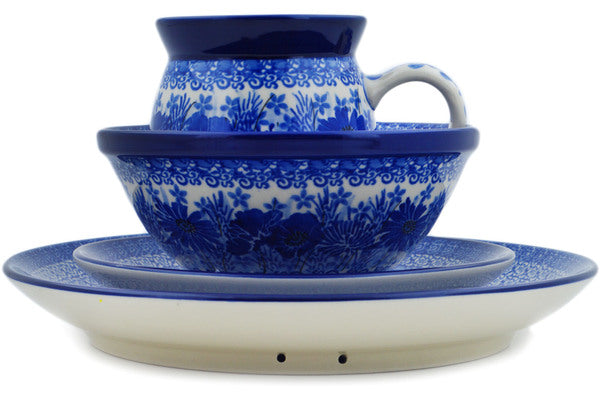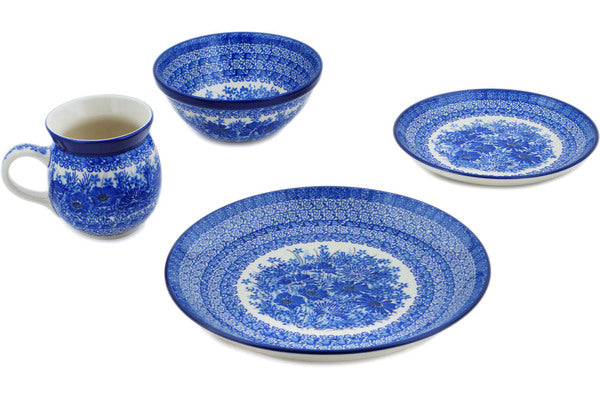 This Dreams In Blue 4-Piece Place Setting was handmade and hand decorated in Boleslawiec, Poland by skilled artisans according to old traditional methods. This is a Polish pottery Signature Unikat, which means that it has been hand painted with both sponges and brushes and it is signed by the artist who painted it. Unikat pieces are the most intricate works of art. Larger Unikat items take hours of very careful work to finish. This Polish stoneware is microwave, dishwasher, freezer, and oven safe up to 480°F. It does not contain lead or cadmium. It is part of the Dreams In Blue Collection.