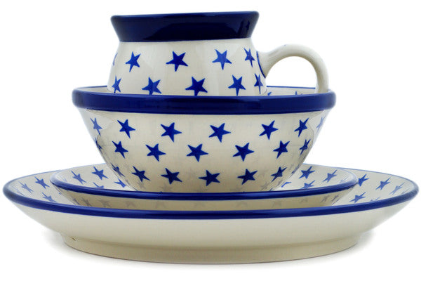 This Starburst Americana 4-Piece Place Setting was handmade and hand decorated in Boleslawiec, Poland by skilled artisans according to old traditional methods. This Polish stoneware is microwave, dishwasher, freezer, and oven safe up to 480°F. It does not contain lead or cadmium. It is part of the Starburst Americana Collection.