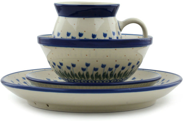 This Water Tulip 4-Piece Place Setting was handmade and hand decorated in Boleslawiec, Poland by skilled artisans according to old traditional methods. This Polish stoneware is microwave, dishwasher, freezer, and oven safe up to 480°F. It does not contain lead or cadmium. It is part of the Water Tulip Collection.
