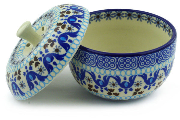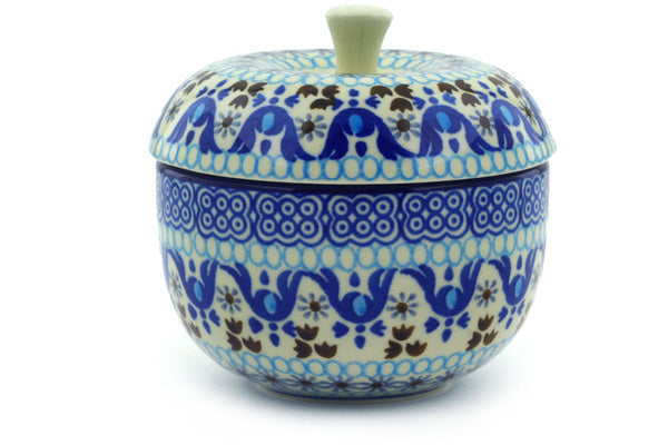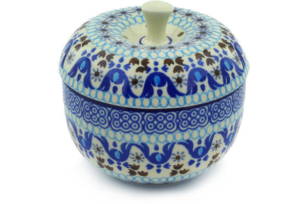 This Blue Ice 4" Apple Shaped Jar was handmade and hand decorated in Boleslawiec, Poland by skilled artisans according to old traditional methods. This Polish stoneware is microwave, dishwasher, freezer, and oven safe up to 480°F. It does not contain lead or cadmium. It is part of the Blue Ice Collection.