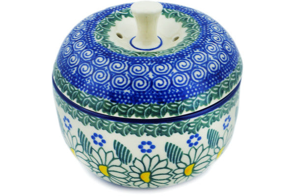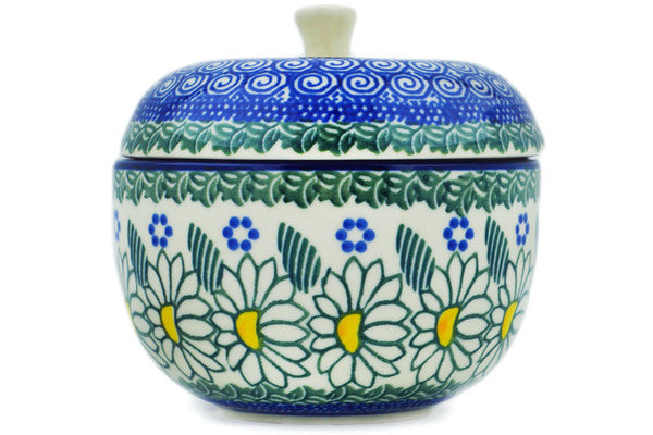 This Crazy Daisy 4" Apple Shaped Jar was handmade and hand decorated in Boleslawiec, Poland by skilled artisans according to old traditional methods. This Polish stoneware is microwave, dishwasher, freezer, and oven safe up to 480°F. It does not contain lead or cadmium. It is part of the Crazy Daisy Collection.