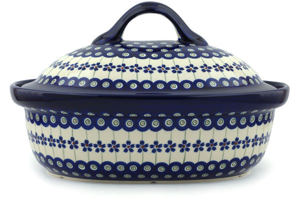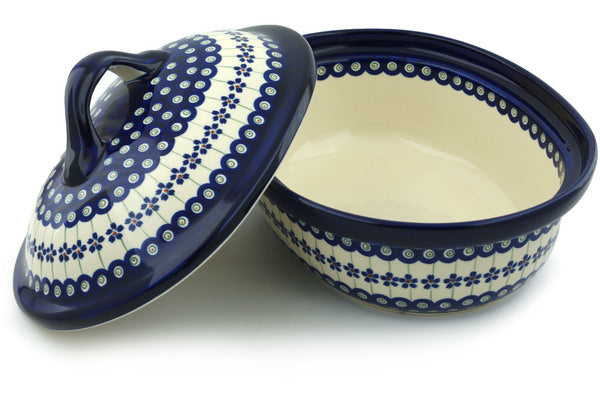 This Flowering Peacock 12" Baker with Cover was handmade and hand decorated in Boleslawiec, Poland by skilled artisans according to old traditional methods. This Polish stoneware is microwave, dishwasher, freezer, and oven safe up to 480°F. It does not contain lead or cadmium. It is part of the Flowering Peacock Collection.