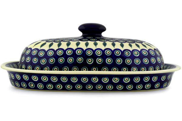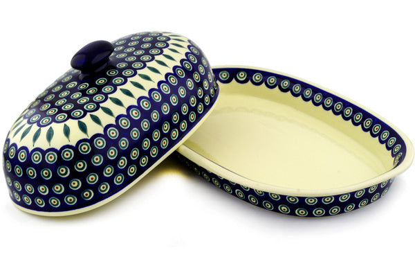 This Peacock Leaves 15" Baker with Cover was handmade and hand decorated in Boleslawiec, Poland by skilled artisans according to old traditional methods. This Polish stoneware is microwave, dishwasher, freezer, and oven safe up to 480°F. It does not contain lead or cadmium. It is part of the Peacock Leaves Collection.