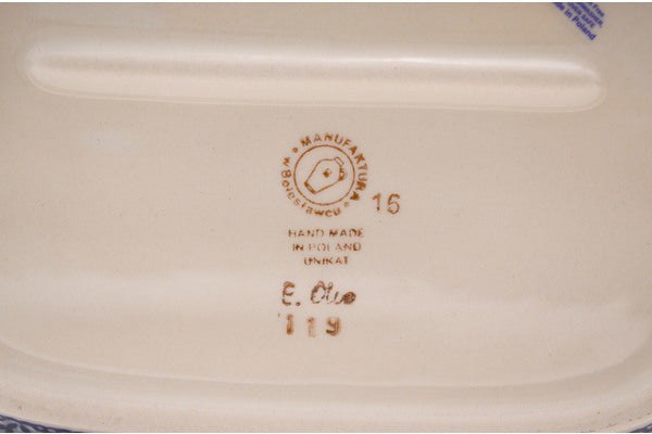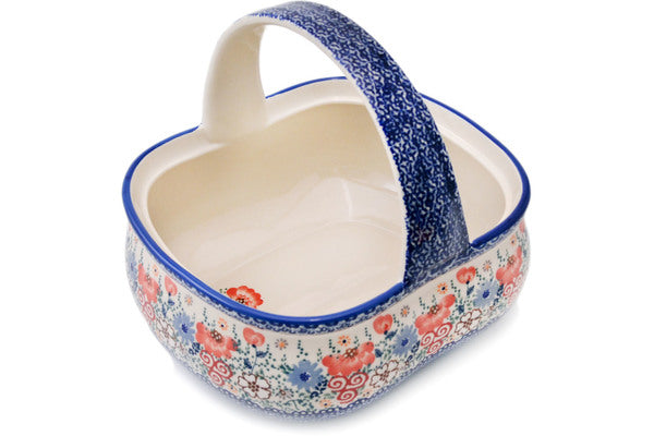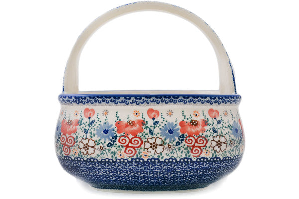 This Blossom Finest 10" Basket with Handle was handmade and hand decorated in Boleslawiec, Poland by skilled artisans according to old traditional methods. This is a Polish pottery Signature Unikat, which means that it has been hand painted with both sponges and brushes and it is signed by the artist who painted it. Unikat pieces are the most intricate works of art. Larger Unikat items take hours of very careful work to finish. This Polish stoneware is microwave, dishwasher, freezer, and oven safe up to 480°F. It does not contain lead or cadmium. It is part of the Blossom Finest Collection.